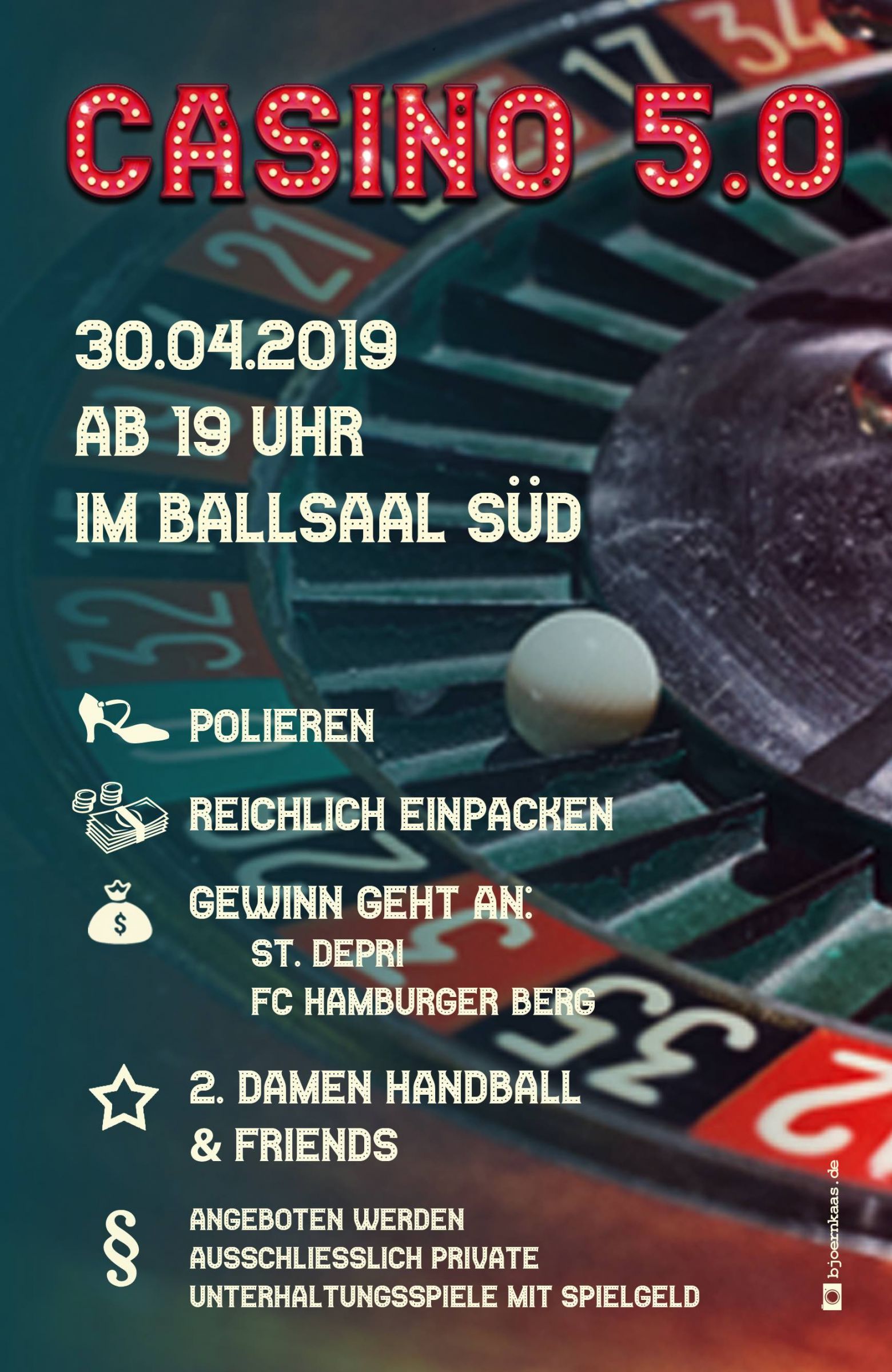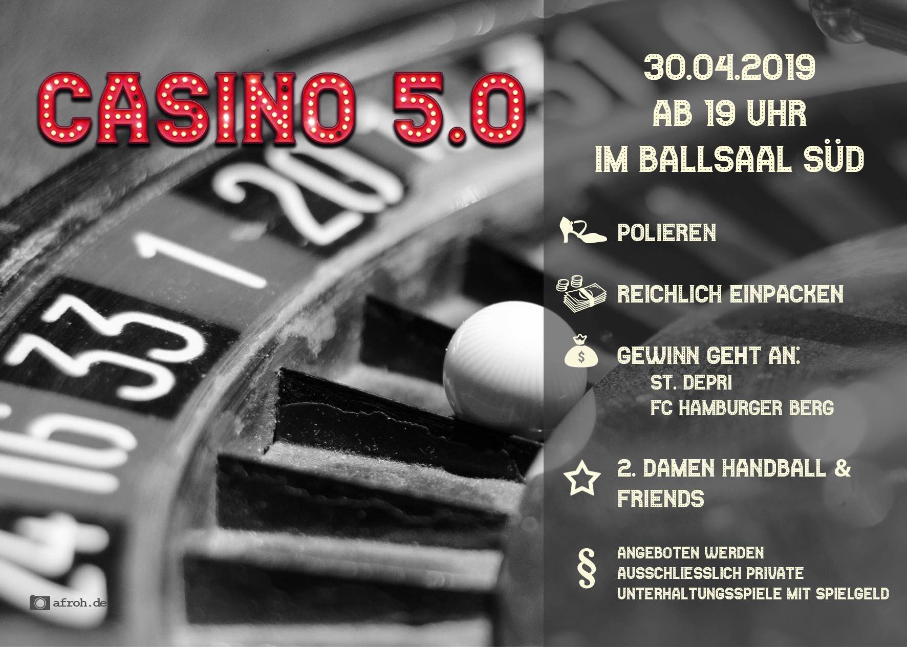 Am 30.04. heißt es zum fünften Mal: rein in den feinen Zwirn und Geld ausgeben, Geld ausgeben, Geld ausgeben, denn das berühmt-berüchtigte Casino öffnet wieder seine Pforten zum Tanz in den Mai. Dieses mal im Ballsaal der Südtribüne.